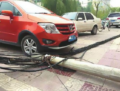 昨天上午8時許,咸陽市渭城區向陽一路風和日麗小區門前人行道,電線桿上有30多根線纜,6輛車被“網”住,幸虧未傷及路人。